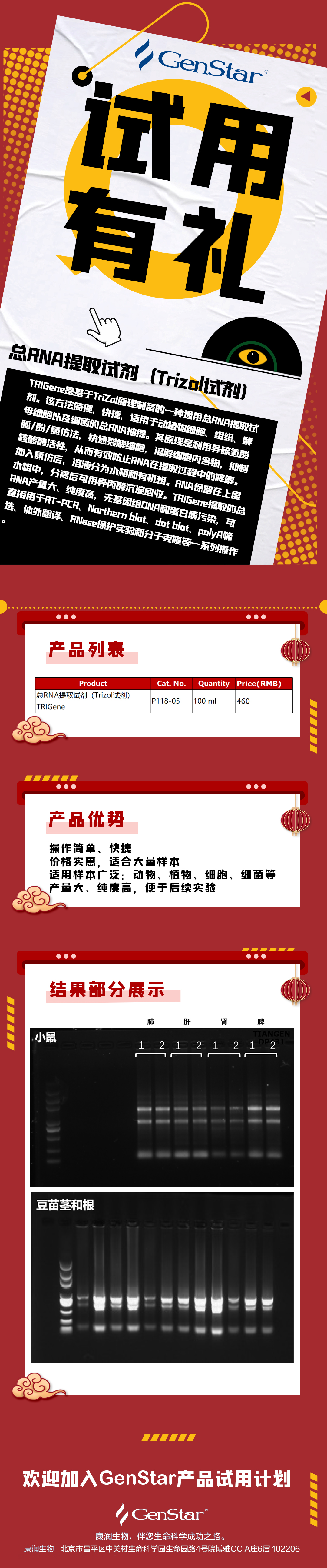 TRIGene是基于TriZol原理制备的一种通用总RNA提取试剂。该方法简便、快捷,适用于动植物细胞、组织、酵母细胞以及细菌的总RNA抽提。其原理是利用异硫氢酸胍/酚/氯仿法,快速裂解细胞,溶解细胞内含物,抑制核酸酶活性,从而有效防止RNA在提取过程中的降解。加入氯仿后,溶液分为水相和有机相。RNA保留在上层水相中,分离后可用异丙醇沉淀回收。TRIGene提取的总RNA产量大、纯度高,无基因组DNA和蛋白质污染,可直接用于RT-PCR、Northern blot、dot blot、polyA筛选、体外翻译、RNase保护实验和分子克隆等一系列操作。