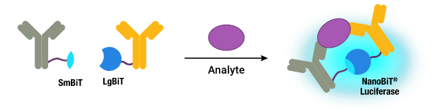 萤光素酶的LgBiT和SmBiT亚基标记。在靶标存在的情况下,这些亚基互相靠近并重新形成有活性的萤光素酶。在添加优化的底物后,会产生明亮的发光信号。