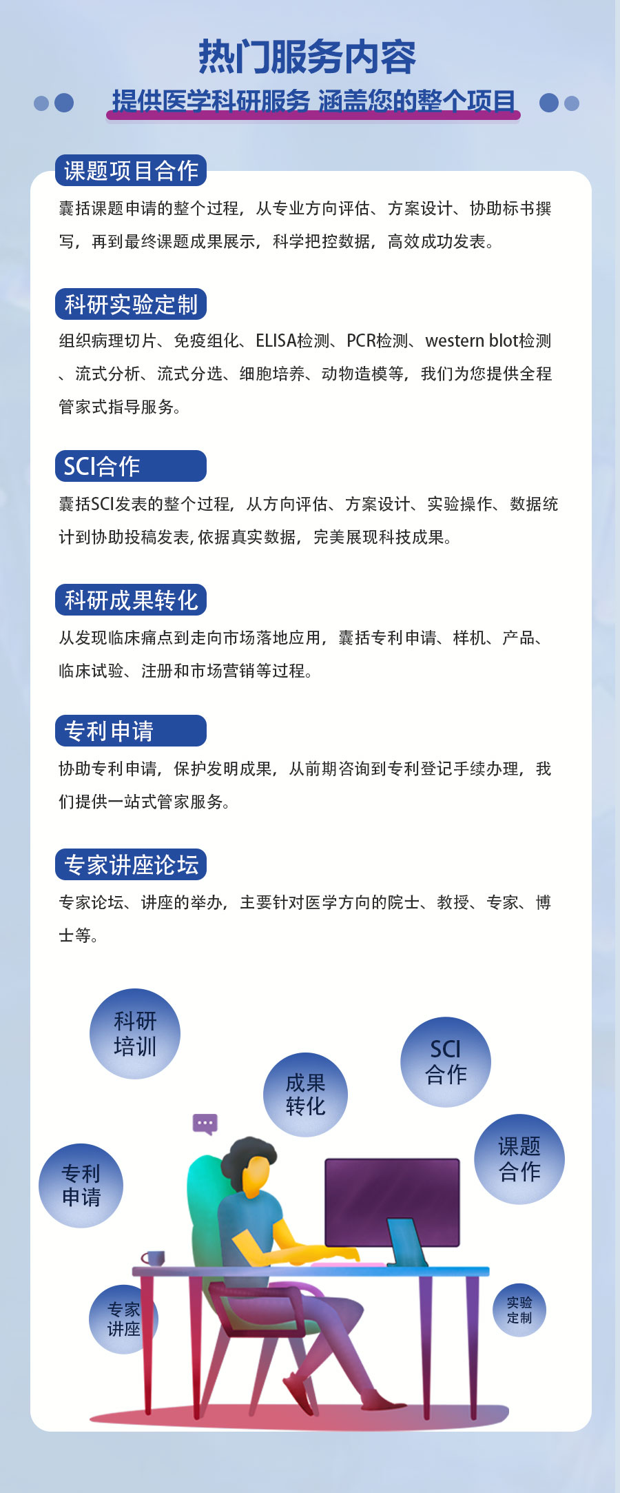 提供医学科研服务,包括课题咨询、实验培训、科研写作咨询等,从基础研究到数据搜集、临床数据统计分析,服务全面