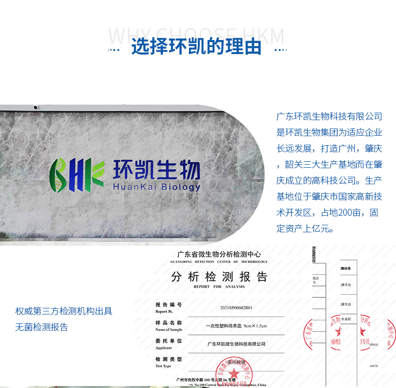 环凯牌一次性培养皿采用全新PS(聚苯乙烯)材料,杜绝采用翻新料和旧料生产,培养皿用料足、透光度好、深受用户青睐和好评。