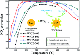 A series of WO3/CeZrO2 catalysts, prepared at different calcination temperatures (400, 500, 600 and 700 °C) of cerium–zirconium mixed oxides (CeZrO2) for the selective catalytic reduction of NOx with ammonia (NH3-SCR), were investigated via various characterizations, such as N2 physisorption, XRD, Raman, NH3-TPD, DRIFTS, XPS and H2-TPR. The catalytic performance of NH3-SCR was remarkably promoted by modestly increasing the calcination temperature of CeZrO2: WO3/CeZrO2-500 possessed the lowest light-off temperature (173 °C) and complete conversion temperature (205 °C), while W/CeZrO2-600 could achieve greater than 90% NOx conversion in a broad temperature range of 220–455 °C. The characterization results indicated that modest enhancement of the calcination temperature of CeZrO2 was beneficial to stabilizing the structure of the catalysts. The largest amount of Lewis acid sites, Ce3+ and surface active oxygen species, as well as strong redox properties of WO3/CeZrO2-500 should together contribute to its better low-temperature deNOx activity. Moreover, increasing the calcination temperature of cerium–zirconium mixed oxides resulted in the enhancement of Brønsted acid sites, which was responsible for the widened operation temperature window. Therefore, WO3/CeZrO2 serial catalysts with appropriate calcination treatment of CeZrO2 would be a good choice for the removal of NOx emitted from diesel engines.