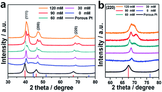 We demonstrated the synthesis of Pt–Ni alloy core–shell nanoparticles (NPs) via a one-pot thermal decomposition method, optimized by variation of the concentration of cetyltrimethylammonium chloride (CTAC) and reaction time. The samples prepared without CTAC and in 30 mM CTAC at 250 °C for 180 min exhibited the formation of single Pt-rich phases between metallic phases. With increasing CTAC concentrations (60–120 mM) at a constant temperature and time (250 °C for 180 min), the products contained both Pt-rich and Pt–Ni alloy phases, consisting of a Pt-rich core with a Pt–Ni alloy shell (Pt-rich@Pt–Ni), in contrast to the single Pt-rich phases prepared at low concentrations or in the absence of CTAC. As the reaction time increased from 10 to 180 min in 60 mM CTAC at 250 °C, the Pt-rich NPs were observed to grow in the initial stage, i.e. until a critical reaction time of 60 min, with subsequent formation of the Pt–Ni alloy phase on top of the as-formed Pt-rich NPs. The morphology and structure of the as-prepared NPs were characterized using TEM, EDX and XRD.