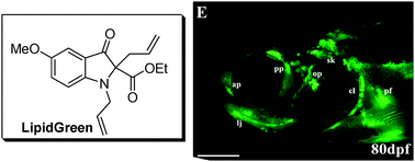 A new small molecule probe for in vivolipid imaging, LipidGreen (compound 5), was developed. LipidGreen stained lipid droplets in 3T3L1 cell lines and fat deposits in zebrafish without apparent toxicity up to 100 μM. The utility of LipidGreen as a drug screening platform for fat regulation was also demonstrated in live zebrafish.