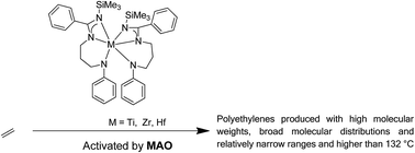 Treatment of the mixed amidinate-amido-lithium, [PhN(CH2)3NC(Ph)NSiMe3]2Li4·2Et2O, with group IV metal chlorides yields the corresponding compounds 3–5. Their structures were confirmed by X-ray diffraction analysis, showing a distorted octahedral geometry. The catalytic behaviors of compounds 3–5 were investigated in the presence of MAO as a co-catalyst. Compounds 3 and 4 showed high activities for ethylene polymerization.