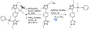 Mononuclear PtII and the first dinuclear PtII complexes along with a cyclometalated heterobimetallic IrIII/PdII complex bearing mesoionic carbene donor ligands are presented starting from the same bis-triazolium salt. The mononuclear PtII complex possesses a free triazole moiety which is generated from the corresponding triazolium salt through an N-demethylation reaction, whereas the mononuclear IrIII complex features an unreacted triazolium unit.