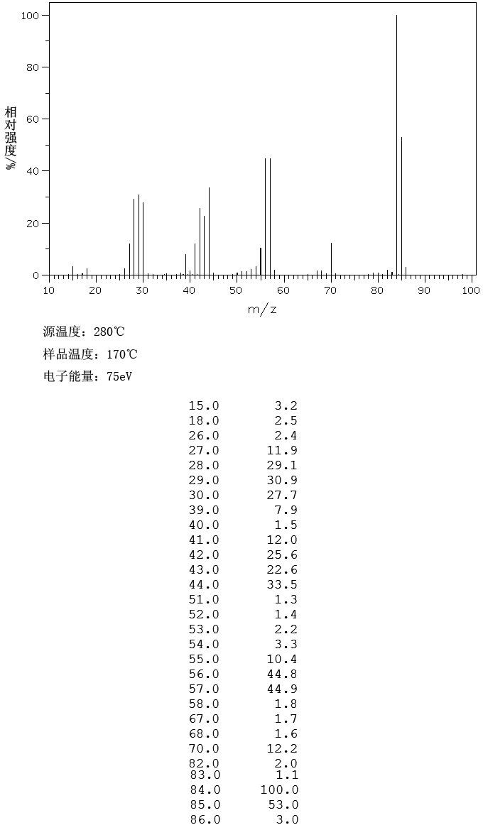2.以吡啶为原料,经催化氢化而得。催化剂为兰尼镍,温度从50℃逐步升到200℃,压力最高达5~7 MPa。通氢气至不吸收为止,反应液过滤,滤液蒸馏收集102~108℃馏分即为产品。
