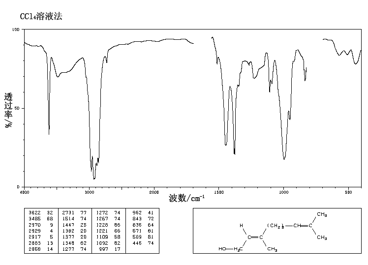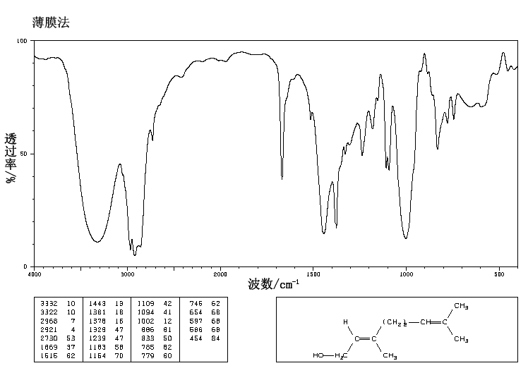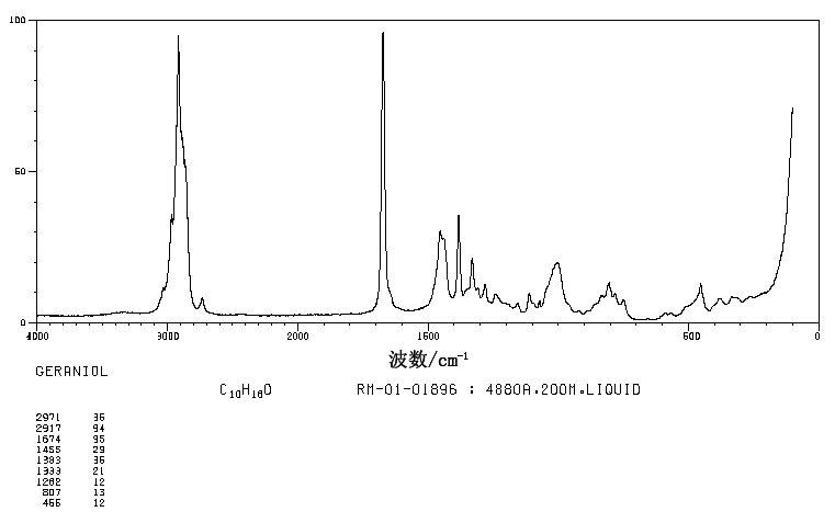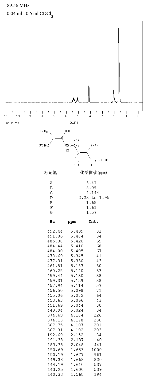 1. 性状:香叶醇与橙花醇互为立体异构体,与芳樟醇互为间位异构体。为无色至淡黄色油状液体,具玫瑰味香气,在空气中易被氧化。