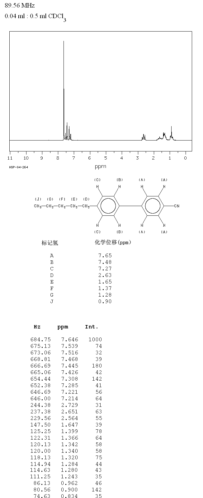 1、将联苯与戊酰氯在三氯化铝存在下进行酰基化反应生成4-正戊酰基联苯,再将其用水合肼、氢氧化钾和一缩二乙二醇还原得4-正戊基联苯。由所得4-正戊基联苯与碘酸-碘在酸性条件下反应生成4-正戊基-4’-碘代联苯,然后将该产物与氰化亚铜反应得到对正戊基联苯腈。