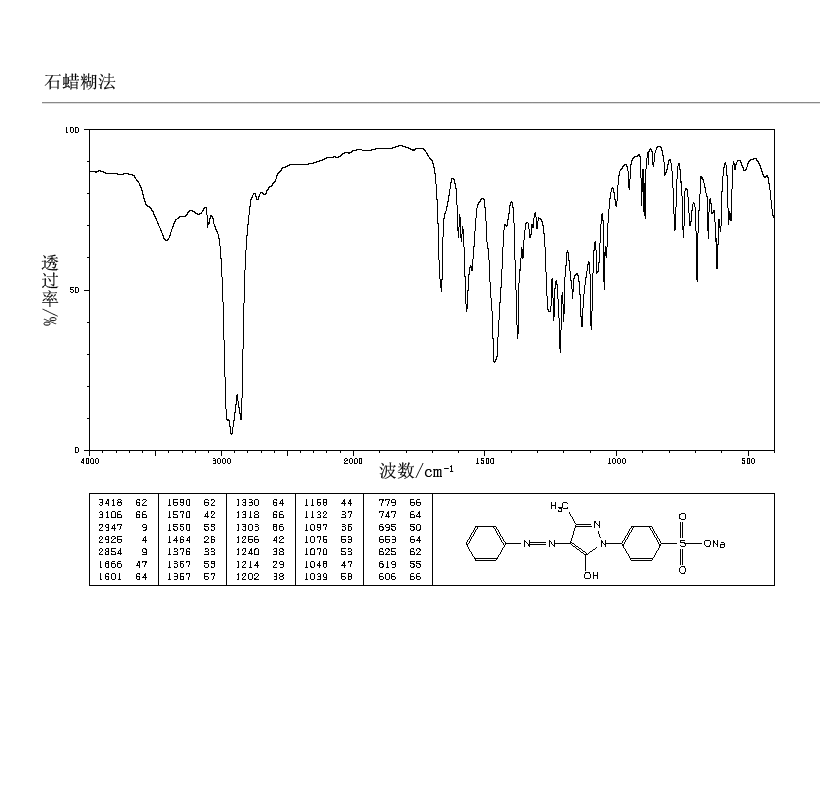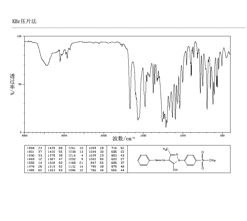 1.苯胺重氮化,与1-(对磺酸基苯基)-3-甲基-5-吡唑酮偶合,盐析而得。1.重氮化 在560L水中,加30%盐酸163kg,加100%苯胺55.8kg,搅拌溶解,加冰降温至0℃,自液面下加入30%亚硝酸钠溶液(相当于100%41.4kg),重氮温度0-2℃,时间30min,此时刚果红试纸呈蓝色,碘化钾淀粉试纸呈微蓝色。最后把体积调整到1100L。2.偶合 铁锅中放水900L,加热至40℃,加纯碱60kg,搅拌全溶。然后加入1-(对磺酸基苯基)-3-甲基-5-吡唑酮154.2kg,溶后再加入10%纯碱溶液(相当于100%48kg)。加冰及水调整体积至2400L,温度2-3℃。把重氮液过筛放入锅内进行偶合。放料时间30-40min。在整个偶合过程中,保持pH8-8.4,温度不超过5℃。偶合毕,1-(对磺酸基苯基)-3-甲基-5-吡唑酮应过量。继续搅拌2h。升温至80℃,按体积20-20%计算加入食盐量,进行盐析,搅拌冷却至45℃以下过滤。在80℃干燥。得100%460kg。原料消耗(kg/t)1-(对磺酸基苯基)-3-甲基-5-吡唑酮 399苯胺(99%) 149 氢氧化钠(100%) 87亚硝酸钠 112 碳酸钠(98%) 145盐酸(31%) 546 精盐 2700