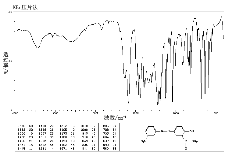1.将间硝基苯胺重氮化,再与水杨酸钠偶合:将100g间硝基苯胺加至400ml盐酸和1.5L水中,加热溶解后冷却至0-5℃,加540g亚硝酸钠溶于水的饱和溶液。重氮化温度始终维持5-10℃,得氮化后将重氮盐慢慢加入116g饱和水杨酸钠的水溶液中,温度控制在15℃以下并严格控制pH在6,继续搅拌4h,放置过夜,过滤得粗品。粗品用于热水溶解,加活性炭及少许氢氧化钠,将pH控制在9,过滤,冷却,结晶即为成品。