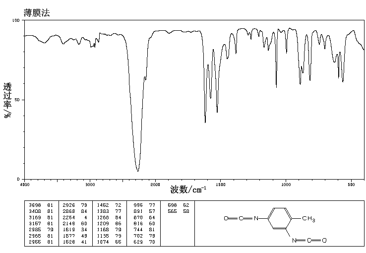2.是聚氨酯工业的十分理想的合成高分子材料聚氨酯的原料。用于合成溶剂型、乳液型和热熔型聚氨酯胶黏剂及其他多种改性胶黏剂。也可用作聚乙烯醇水溶性胶黏剂的改性剂,提高耐水性。用TDI制成的聚氨酯材料主要应用于制作各种软质和硬质的泡沫塑料、聚氨酯橡胶、聚氨酯涂料,其优异性能和广泛用途使TDI成为异氰酸酯化合物中应用最广泛的品种之一。