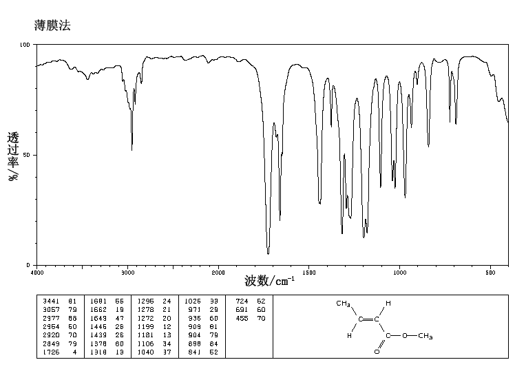 标签 | 2-丁烯酸甲酯, 丁烯酸甲酯, Trans-Methyl crotonate, (E)-2-Butenoic acid methyl ester, Crotonic acid methyl ester, 脂肪族化合物 |