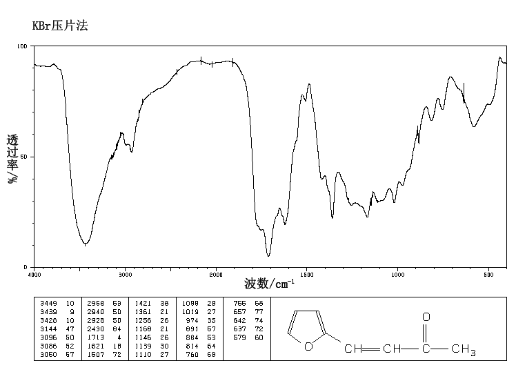 于装有搅拌器、温度计的反应瓶中,加入新蒸馏过渡糠醛(2)77g(0.75mol),600mL水,125mL丙酮,搅拌下冰水浴冷却至10℃,加入15mL(33%)的氢氧化钠水溶液,反应放热。室温搅拌反应4h。用10%的稀硫酸调至弱酸性。静置分层。水层常压蒸馏,直至馏出物澄清。分出油层,与上面的油层合并。将油层物减压蒸馏,收集114~118℃/1.33kPa或135~145℃/6.65kPa的馏分,得4-(2-呋喃基)-3-丁烯-2-酮(1)60~65g,冷后固化为黄色固体,mp37~39℃,收率60%。[1]